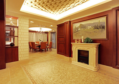 紧挨卧室的半开放空间,虽然仅仅只有一个壁炉造型的储物柜,但在柜子上仿古时钟和摆件以及油画和红木墙壁的映衬下,一股浓浓的西方复古风扑面而来。