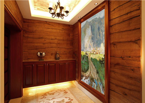 电视墙两旁相对的红木做成的凹凸造型错落有致,正中错落有致的小方块,在这个具有历史气息感的房间里,既富时尚感却又不那么突兀。