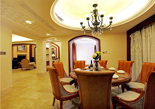 餐厅采用了中式圆桌,和上方的圆形吊顶正好搭配得当,此外,复古的水晶吊灯营造了一种豪华之感,在这里一家人围桌用餐想必是一件极为享受的事情。